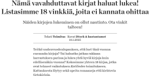 ”Näiden kirjojen lukeminen on ollut nautinto. Ota vinkit talteen!”Teitkö uudenvuodenlupauksen, että luet tänä vuonna enemmän kirjoja? Tai haluatko jatkaa rakkaan harrastuksen parissa ja lukea yhtä hyviä kirjoja kuin edellisenäkin vuonna? Kokosimme yhteen 18 kirjaa, jotka ovat tehneet vaikutuksen Kotilieden toimitukseen. Kattauksesta löytyy sekä upeita romaaneja että kiehtovia tietokirjoja. Psalmien kuiskaajat-romaani listalla mukana.